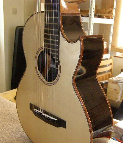 FOR SALE: UK £ 1,350. A 10-string, steel-string harp guitar made in 2007. There is a mark on the the bass side where the instrument had a knock, hence the low price. Otherwise it is a beautiful, concert-size (15" width) instrument. French-polish finish, Mahogany neck, Indian Rosewood back and sides with a European Spruce soundboard. Mother of Pearl rosette. The guitar has a half set of Schaller mandolin tuners and a set of open-back Gotoh tuners. Scale is 648 mm, and the nut is 46 mm. Buyer pays for shipping, duty, etc. It has a wonderful sound -- especially the basses. Please email Stephen Sedgwick for more info. WEBSITE